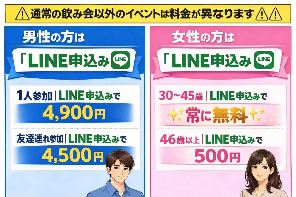 リーズナブルな参加費な上に予約の仕方次第では男女共に割引適用適用何処のイベントよりもクオリティー高いイタリアンで参加できてリーズナブル♪