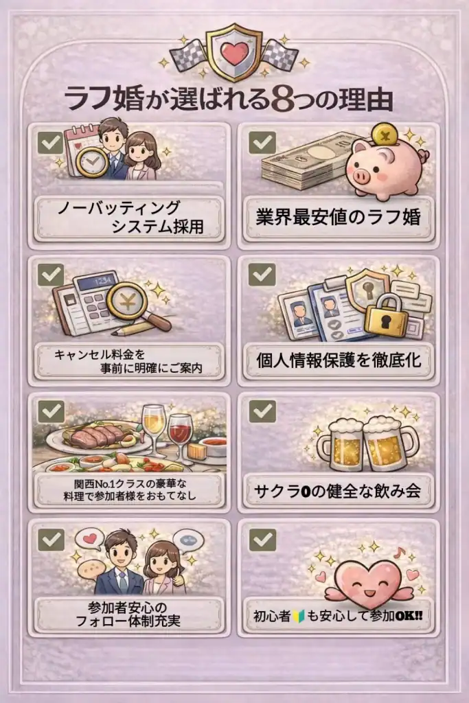 お見合いや合コンと違いガチガチな感じではなく、等イベントではラフな格好でラフに楽しめてなお、「婚活」、「恋活」、「友活」により真剣な人が集まるのが大阪のラフ婚パーティー・飲み会の特徴です♪